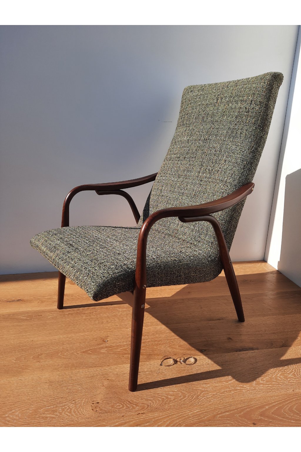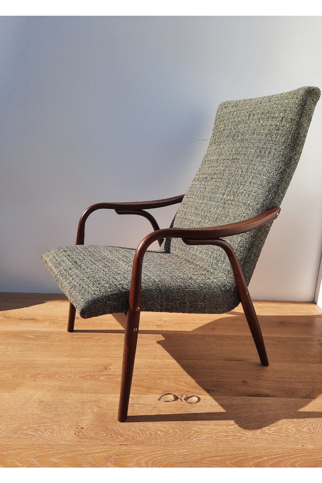 Područky a nohy jsou vyrobeny z ohýbaného bukového dřeva. Dřevo jsme zbavili starých nátěrů, namořili na odstín ořech a nalakovali polomatným polyuretanovým lakem na nábytek.