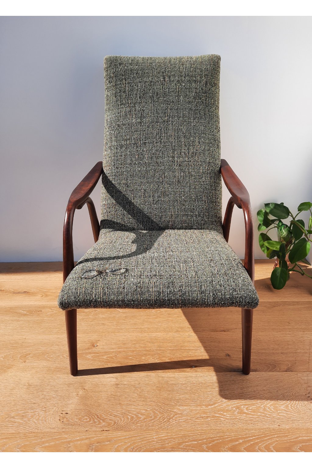 Staré čalounění jsme odstranili, natáhli nové popruhy, dali novou studenou pěnu a potáhli naší oblíbenou potahovou látkou.