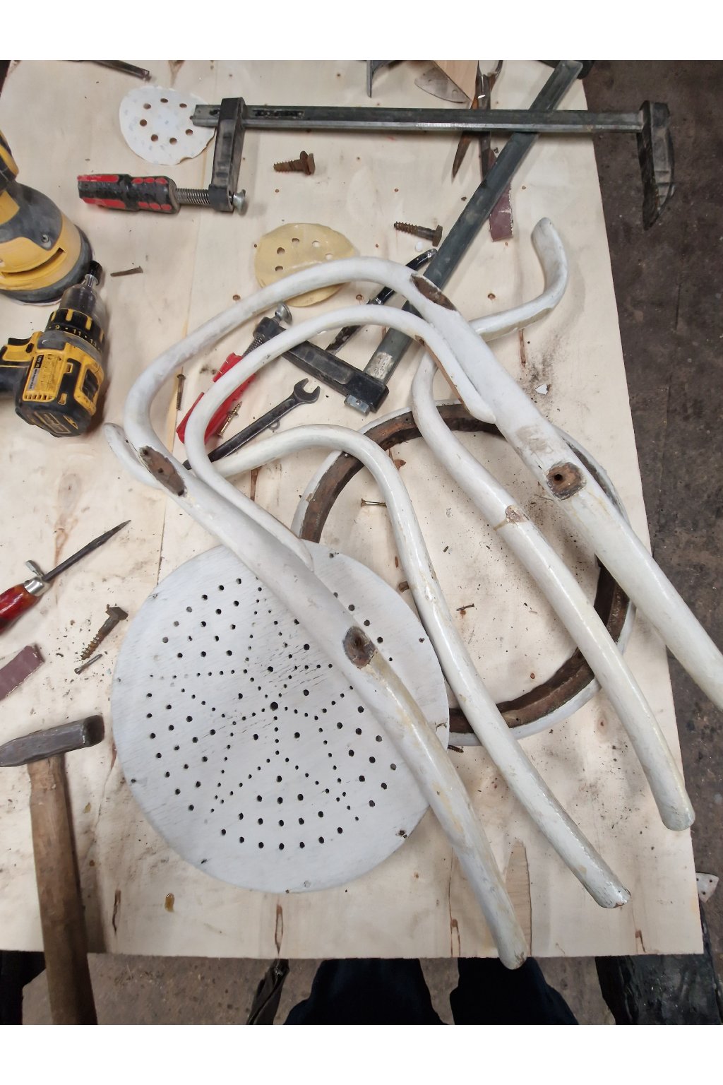 Křesílko jsme rozebrali na jednotlivé díly, obrousili letité nánosy barev na dřevo. Oříšek je vždy dostat bílou barvu z nábytku. Podařilo se nám zachovat i původní originál sedák. Fotku průběhu renovace najdete ve fotogalerii.