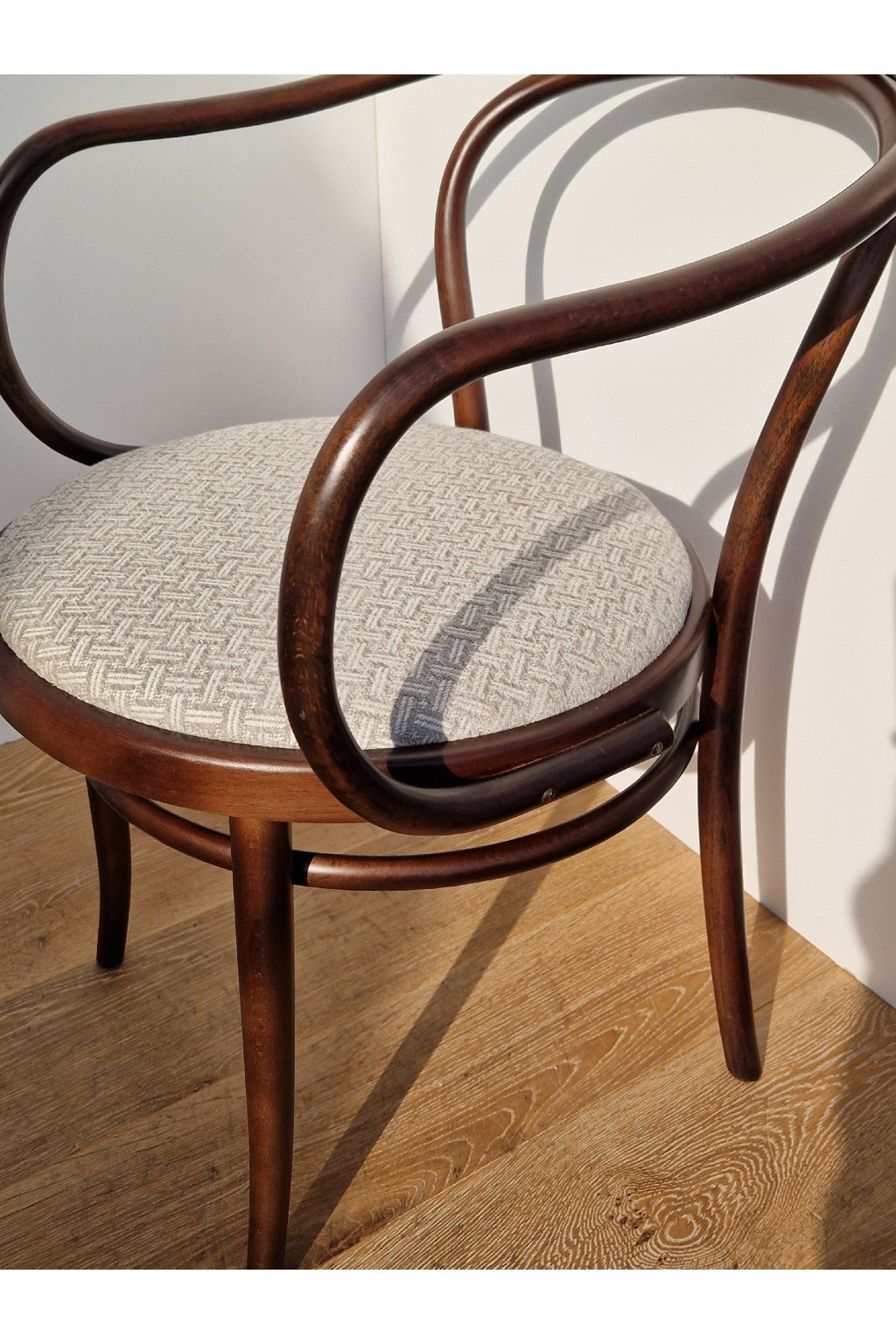 Staré čalounění a molitan jsme ze sedáku odstranili a vyměnili za nový kvalitní přírodní latex. Očalouněno velmi kvalitní tkanou potahovou látkou šedobéžovou barvy která v kombinaci s tmavým ořechově mořeným dřevem vypadá velice luxusně. Látka je velice kvalitní, má vysoké Martendale 69.000 otáček, je příjemná na dotyk. Má speciální povrchovou úpravu Easy clean pro snadné čištění.