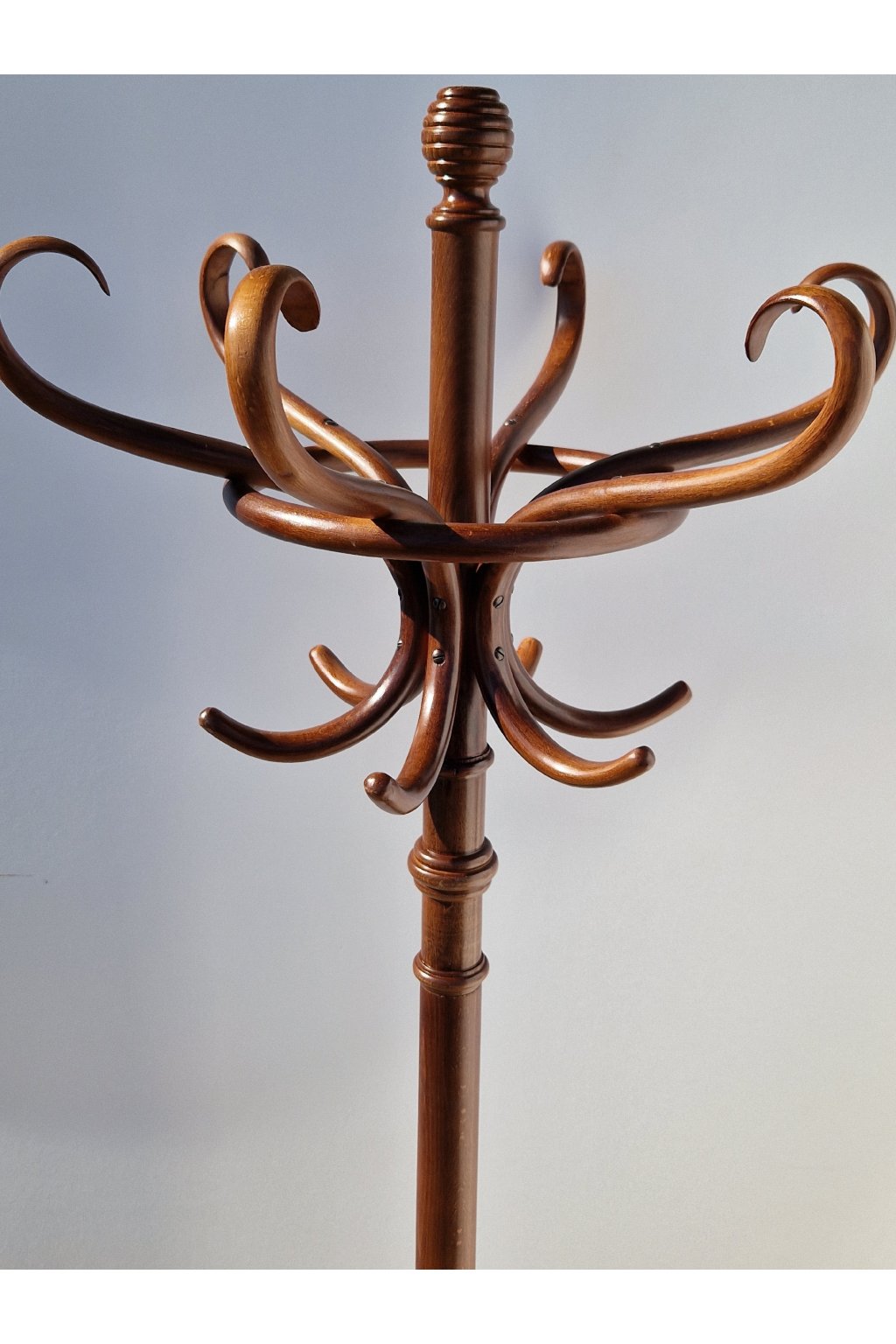Podlahový starožitný věšák z ručně ohýbaného bukového dřeva s největší pravděpodobností od firmy Thonet, neznačený. Datace začátek 20. století, Vídeňská secese