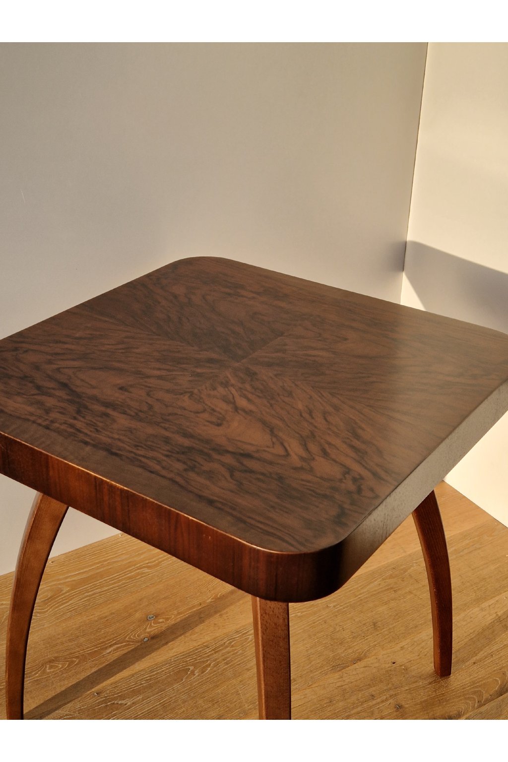 Legendární nadčasový stolek Pavouk od návrháře Jindřicha Halabaly s nádhernou jedinečnou výraznou ořechovou dýhou na desce stolu.